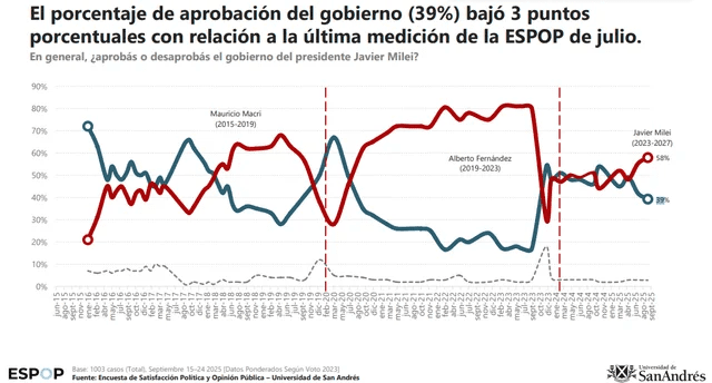 D’Alessio IROL–Berensztein sitúa la desaprobación en 57 %. (El gráfico de la ESPOP traza una pendiente descendente desde los picos post-devaluación, evocando las horas bajas de crisis peronistas pasadas).