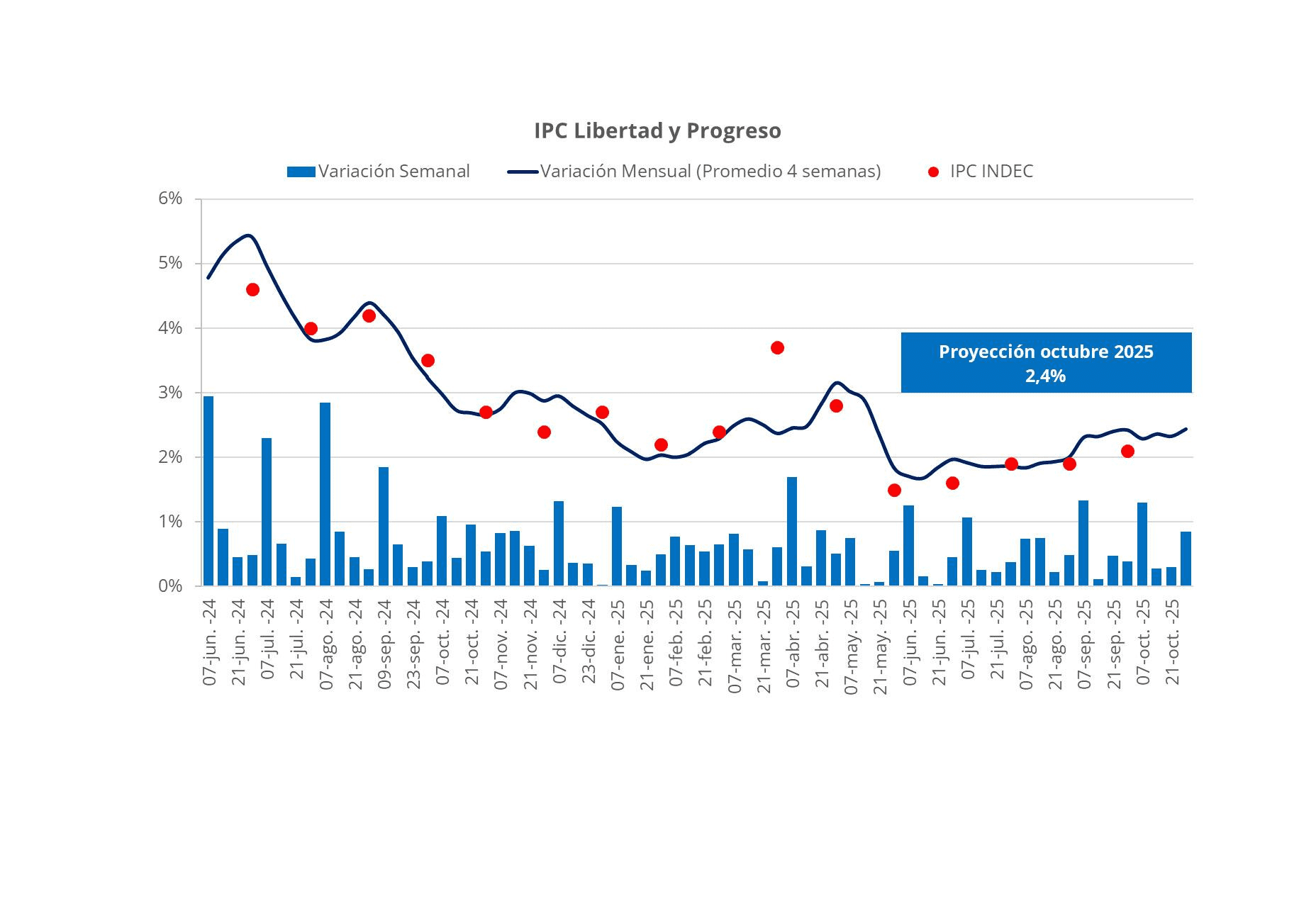 Según las consultoras privadas, el ritmo de aumento en los precios fue mayor en octubre que en septiembre. Los pronósticos menos optimistas la ubican en 2,4% como es el caso de Fundación Libertad y Progreso, favorable a la línea política del Gobierno. La misma proyección tiene la consultora Eco Go.