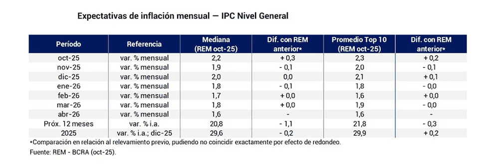 En el último Relevamiento de Expectativas de Mercado (REM) del Banco Central de la República Argentina (BCRA), la mediana de las respuestas indico que la inflación en octubre sería del 2,2% (una aceleración de 0,1 p.p.).