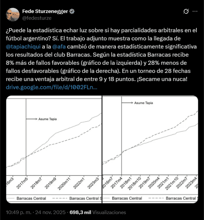 Según el funcionario, los fallos arbitrales habrían beneficiado a El Guapo desde la llegada de Tapia a la presidencia de la AFA, en 2017. «¿Puede la estadística echar luz sobre si hay parcialidades arbitrales en el fútbol argentino? Sí. El trabajo adjunto muestra como la llegada de Claudio Tapia a la AFA cambió de manera estadísticamente significativa los resultados del club Barracas«, aseguró Sturzenegger.