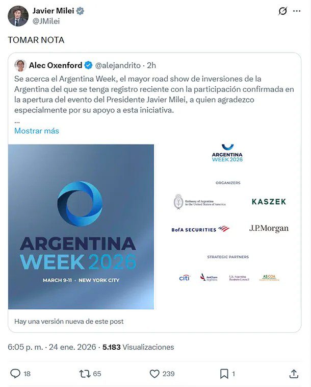 Además, “a lo largo de la semana intervendrán el Canciller Pablo Quirno, el Ministro de Economía, Luis Caputo, el Jefe de Gabinete Manuel Adorni y el Ministro de Desregulación y Transformación del Estado, Federico Sturzenegger, quienes expondrán los lineamientos centrales de la estrategia política, económica y regulatoria del gobierno argentino”, amplió el embajador en redes sociales.