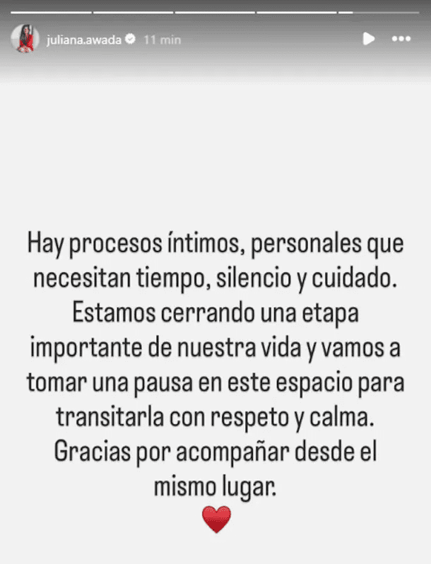 «Hay procesos íntimos, personales que necesitan tiempo, silencio y cuidado. Estamos cerrando una etapa importante de nuestra vida y vamos a tomar una pausa en este espacio para transitarla con respeto y calma. Gracias por acompañar desde el mismo lugar», escribió la ex primera dama en su cuenta de Instagram.