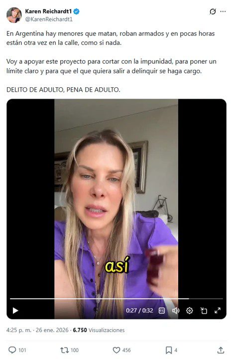 La diputada nacional de La Libertad Avanza (LLA) Karen Reichardt defendió este lunes el proyecto de reforma de la Ley Penal Juvenil, que incluye la baja de la edad de imputabilidad y que el Gobierno incorporó en el temario de sesiones extraordinarias del Congreso para el mes de febrero.