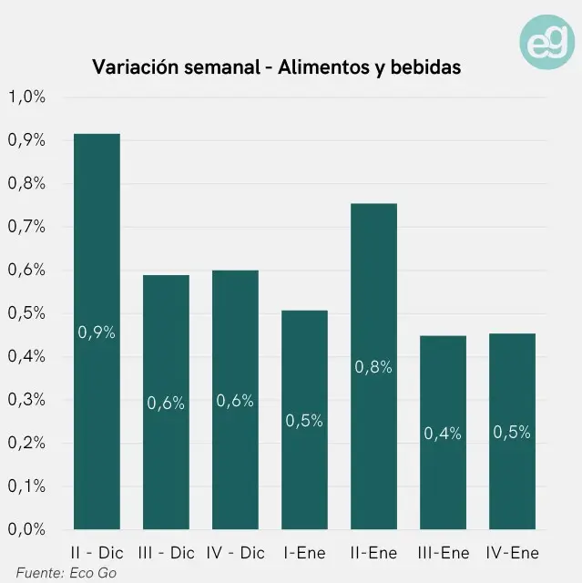 El relevamiento de precios correspondiente a la cuarta semana de enero de la consultora Eco Go mostró una aceleración en los valores de los alimentos, luego de un arranque de mes más moderado. En promedio, los precios del rubro avanzaron 0,5% semanal, consolidando una tendencia que mantiene a la inflación mensual de alimentos por encima del 2,5%.