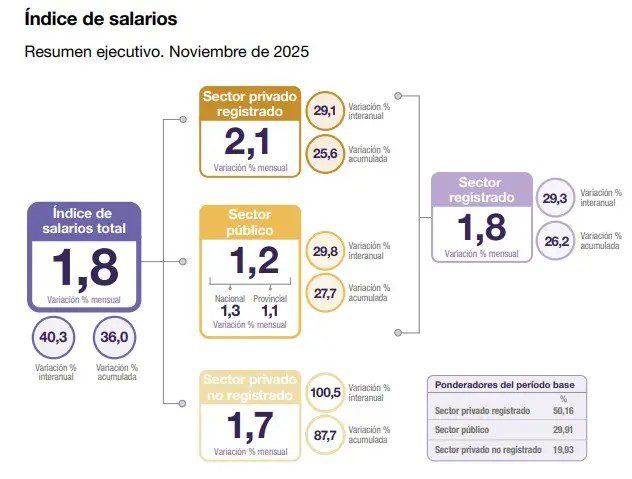 En noviembre de 2025, el índice de salarios avanzó 1,8% mensual y quedó por debajo del 2,5% que marcó el índice de precios al consumidor que relevó el Indec en el mismo mes. En términos interanuales, los salarios crecieron 40,3%.