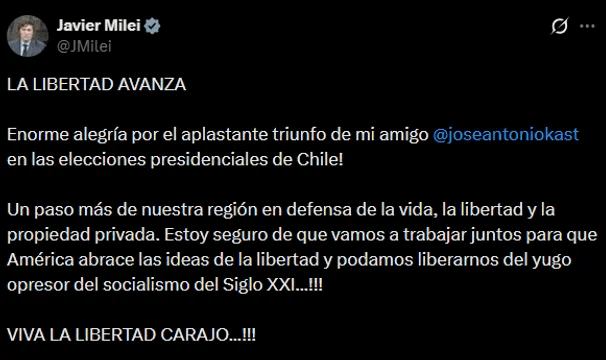 El jefe de gabinete, Manuel Adorni, también utilizó sus redes sociales para saludar a Kast y felicitar la elección del ahora mandatario chileno: “La libertad y la defensa de la propiedad privada serán parte del camino que viene. Dios bendiga a Chile”, agregó.