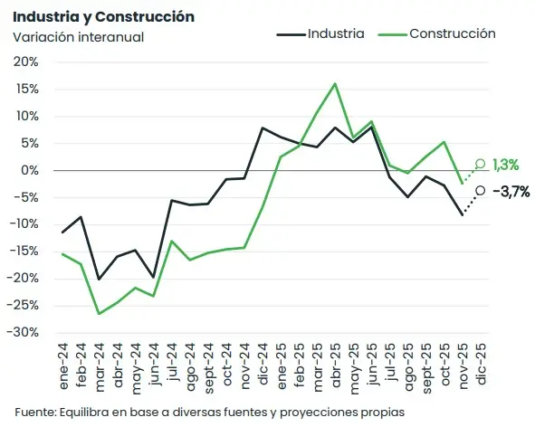 Según el informe, al excluir el agro, la actividad económica cayó cerca de 0,7% frente a noviembre y acumuló dos meses consecutivos de retroceso interanual. Este comportamiento refuerza la idea de que la recuperación no es homogénea y que depende de factores puntuales más que de una mejora generalizada de la demanda.