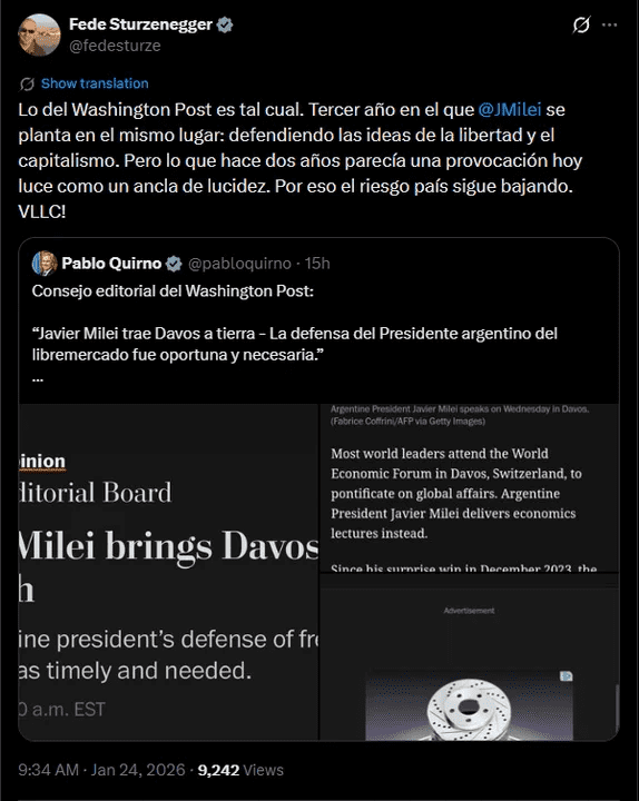El ministro de Transformación y Desregulación del Estado, Federico Sturzenegger, se refirió a la editorial que realizó el viernes el diario The Washington Postsobre el paso del presidente Javier Milei en Davos y su discurso.