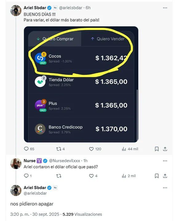 El encargado de encender la mecha fue el propio CEO de Cocos, Ariel Sbdar, quien a través de la red social X respondió a un usuario que no podía operar: «Nos pidieron apagar«. La escueta frase desató una catarata de preguntas sobre quién había dado la orden y por qué.