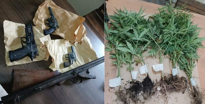 Durante el procedimiento, los uniformados hallaron tres armas de fuego —dos revólveres y una escopeta— escondidas entre muebles y objetos del domicilio. Además, en una de las habitaciones se encontraron seis macetas con plantines de una sustancia vegetal, la cual fue sometida a pruebas de campo por personal de drogas peligrosas, confirmándose que se trataba de marihuana.
