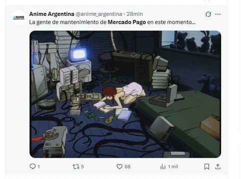 Pero como suele ocurrir en Argentina, el caos rápidamente dio paso al humor y la resignación. Las redes se llenaron de memes que graficaban la situación con ingenio. «La gente de mantenimiento de Mercado Pago en este momento…», posteó la cuenta @anime_argentina junto a una imagen de caos y fuego, desatando las risas de los damnificados.